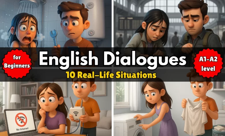 In this video, you’ll learn 10 simple English dialogues based on daily situations like “No Hot Water”, “Lost Keys”, and “Flat Tire”.